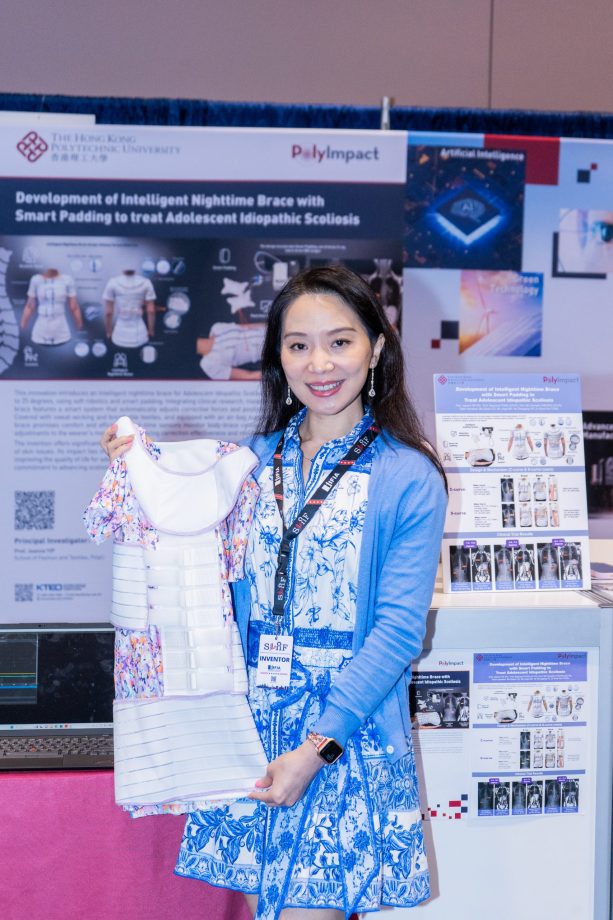 Professor Yip’s awarded project titled “Development of Intelligent Nighttime Brace with Smart Padding to Treat Adolescent Idiopathic Scoliosis” introduces an intelligent nighttime brace for Adolescent Idiopathic Scoliosis (AIS) patients with a Cobb’s angle of 10 to 25 degrees, using soft robotics and smart padding. Integrating clinical research, material science, and wearable technology, the brace features a smart system that automatically adjusts corrective forces and positioning, ensuring optimal spinal correction. Covered with sweat-wicking and breathable textiles, and equipped with an air-bag support belt for additional tractive forces, the brace promises comfort and efficiency. Real-time sensors monitor body-brace contact and sleeping posture, allowing dynamic adjustments to the wearer’s movements, enhancing correction effectiveness, and minimising discomfort.