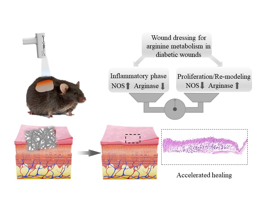 Wound healing involves biochemical and multicellular events with sequential complexity. Arginine metabolism is an alternative strategy for developing wound healing materials with capabilities for regulating the wound microenvironment. The project explores the design strategy of bioactive wound dressing materials with broad tunability and adaptability to address the challenges from different wound stages, with sequential regulation of wound microenvironment to facilitate the healing process.
